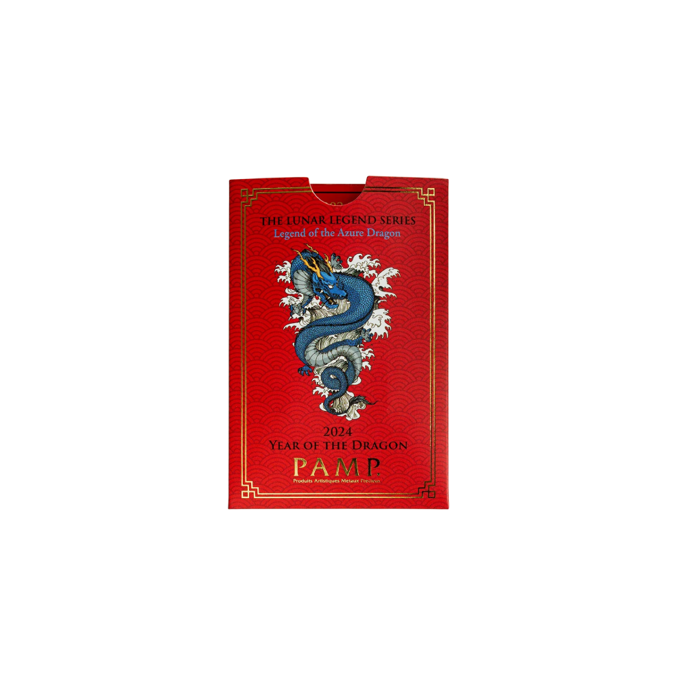 Crafted by PAMP, a world renowned Swiss precious metals refinery accredited by the Swiss Central Bank and the LBMA with a legacy of excellence in combining precision and artistry.. The PAMP Suisse Lunar Legends Azure Dragon 5 Grams Gold Bar is released to commemorate The Year of The Dragon 2024. A prestigious addition to any collection or portfolio